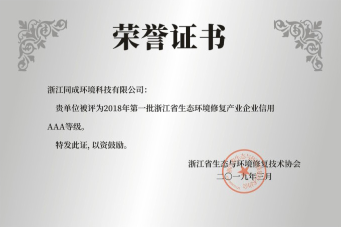 2018年度第一批浙江省生態環境修復產業企業信用AAA等級